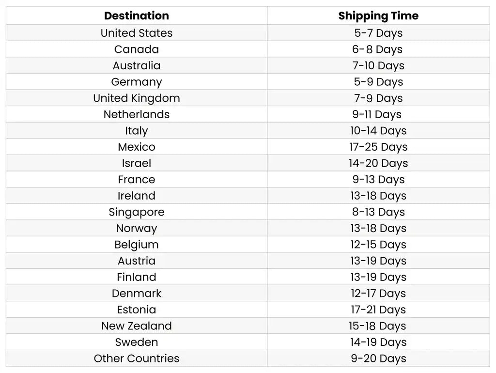- Items are generally shipped within the aforementioned timeframe. However, due to possible circumstances such as inclement weather and difficult transportation road conditions, there may be a 2-3 day delay.
